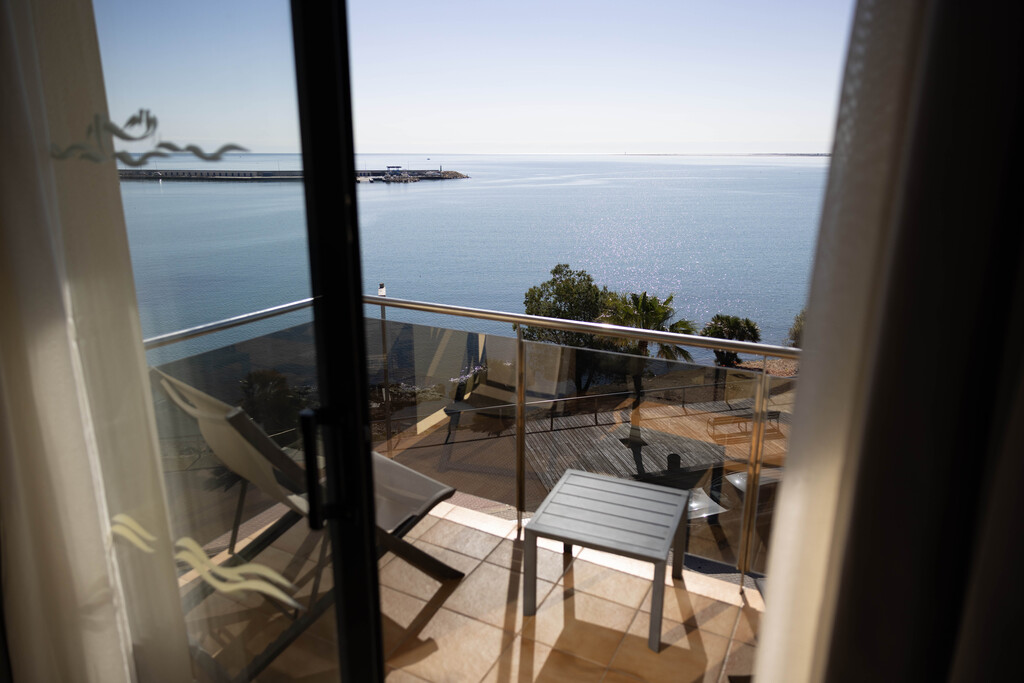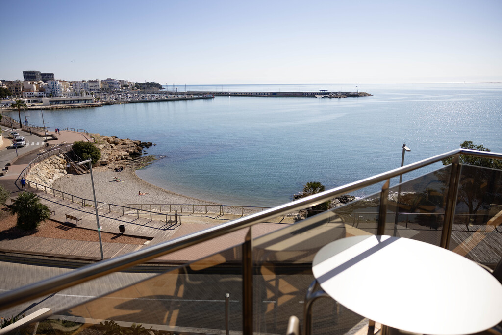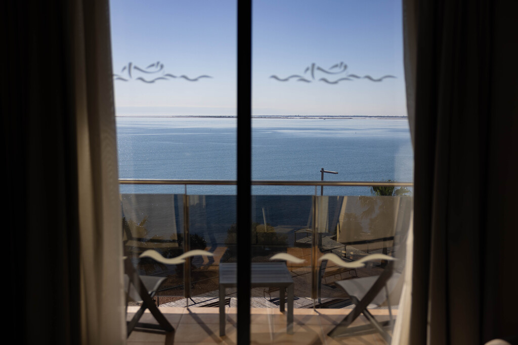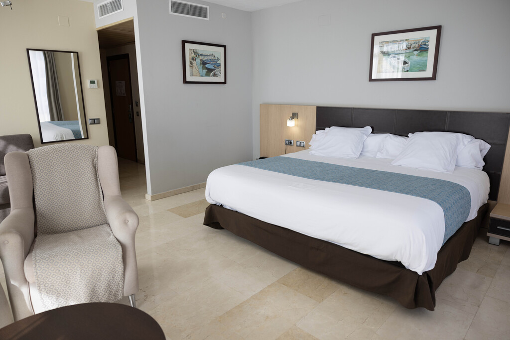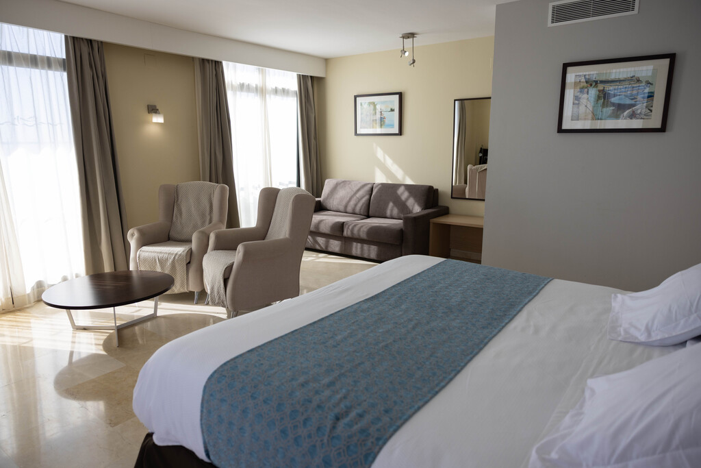 This room has frontal views of the sea, a double bed, a whirlpool bath and a terrace. It has a sofa bed where two children (under 12 years old) fit. This room also includes a minibar with two complimentary bottles of water on the day of entry.