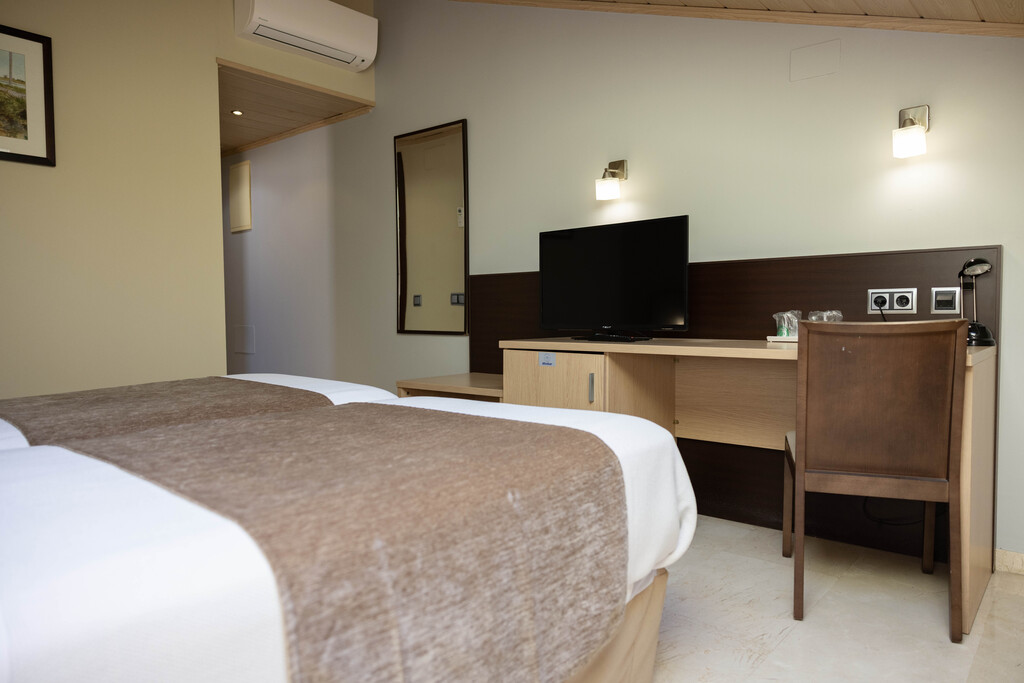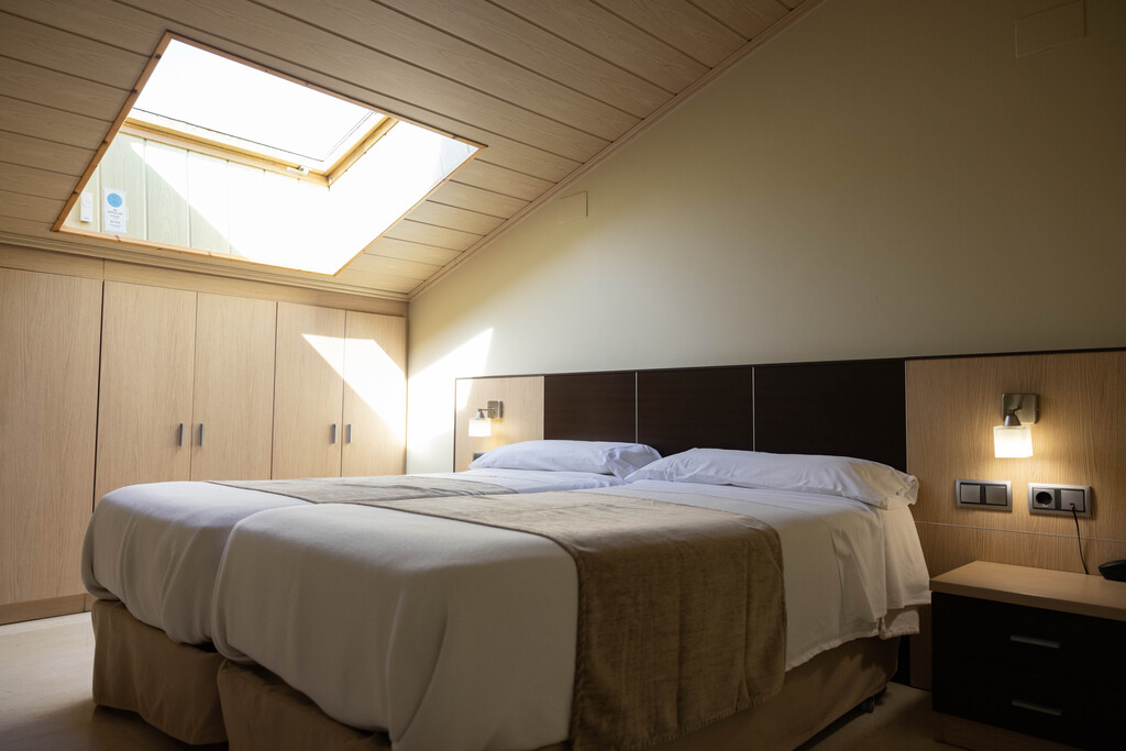 Habitación con techo inclinado y ventana en el mismo techo. No tiene vistas exteriores. Consta de dos camas individuales. Esta habitación también incluye minibar con dos botellitas de agua de cortesía el día de entrada.